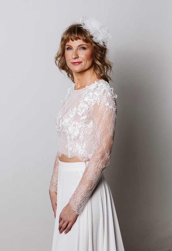 Krótka bluzka ślubna z delikatnej koronki w kolorze écru, o lekkiej i subtelnej formie. Dekolt w łódkę podkreśla linię ramion, a transparentna struktura materiału nadaje stylizacji lekkości.