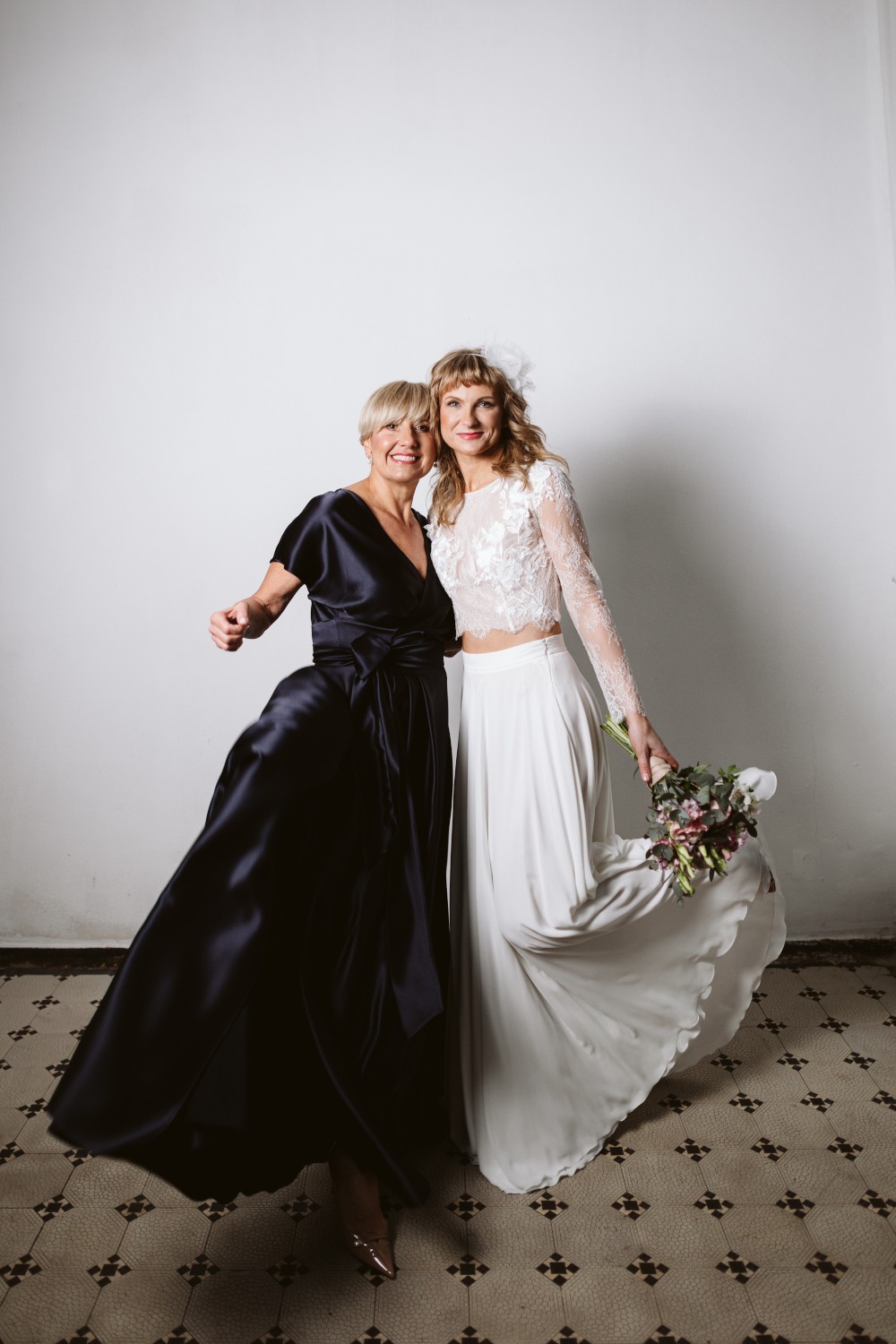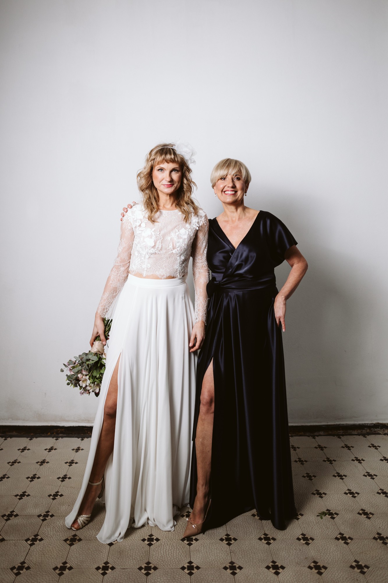 Kreacja szyta jest na miarę w naszej pracowni w Szczecinie. Rekomendujemy realizację z przymiarkami na miejscu, które pozwalają na idealne dopasowanie bluzki i spódnicy do sylwetki.