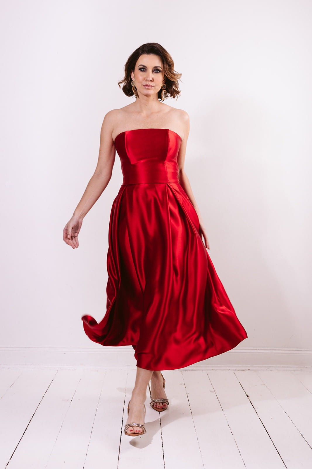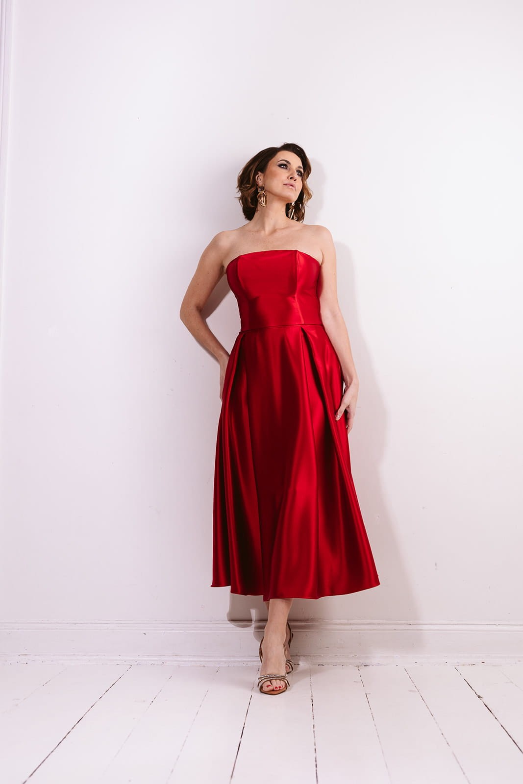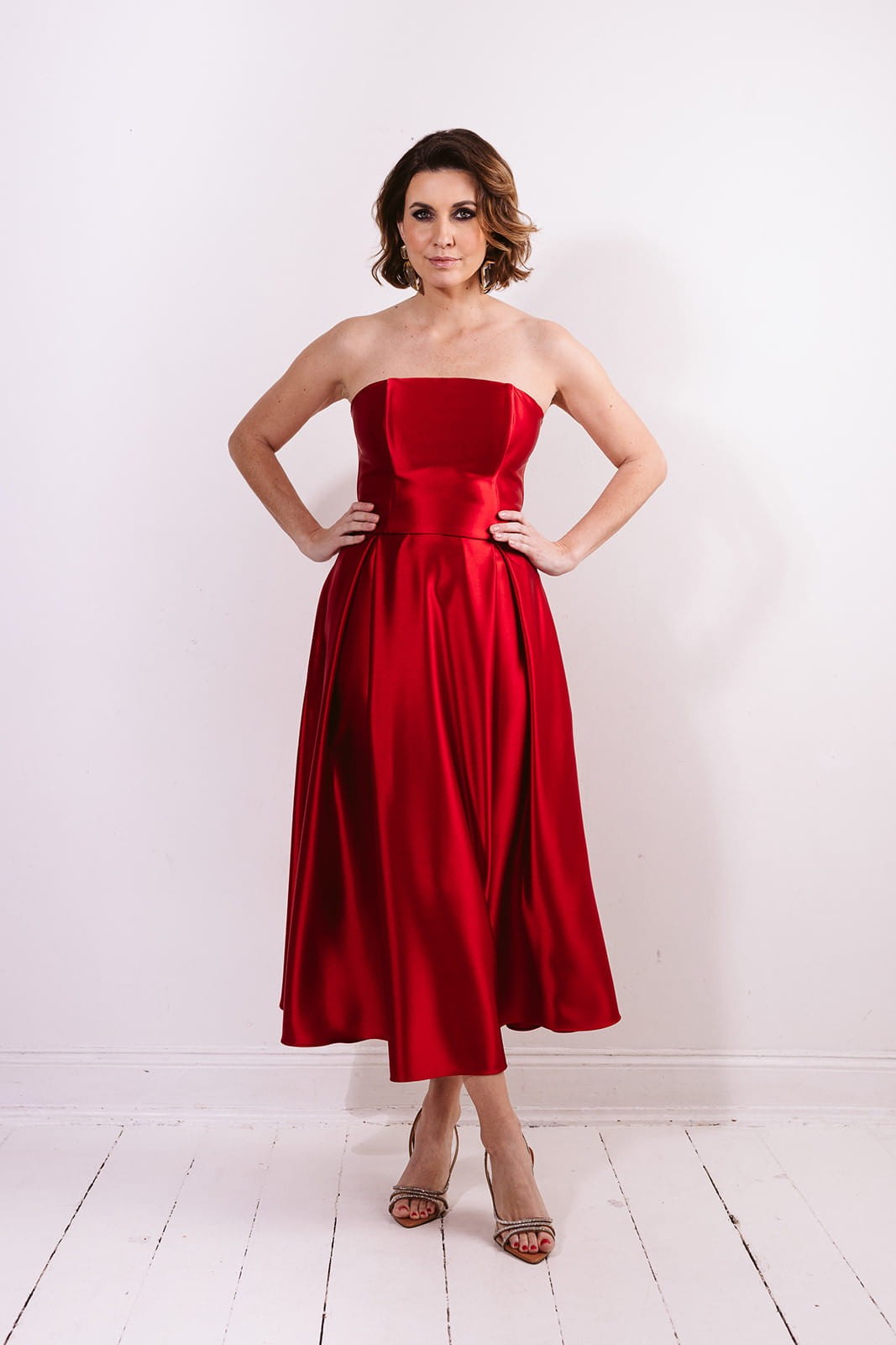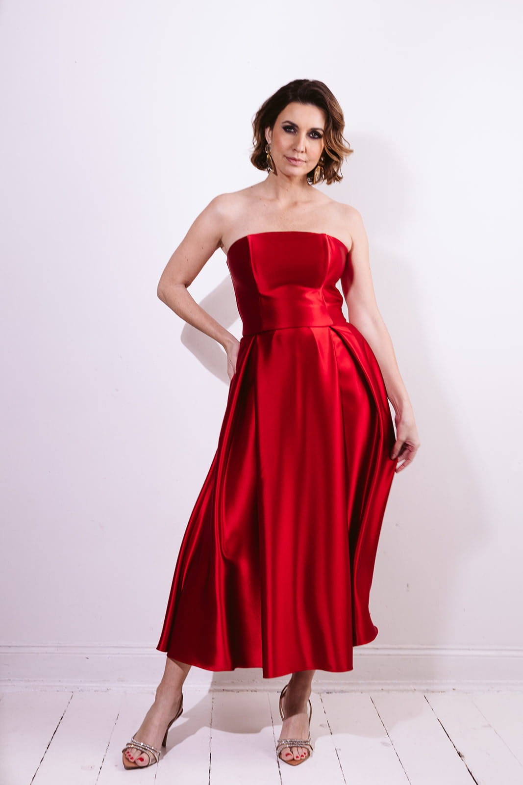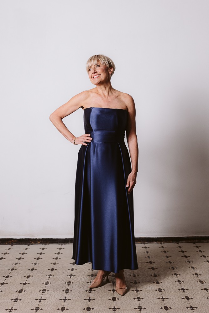 Całość wykonana jest z wysokogatunkowej satyny triacetatowej o szlachetnym wykończeniu i subtelnym połysku. To propozycja na wyjątkowe okazje — galę, wesele czy wieczorne wyjście — a także doskonała baza do tworzenia wielu stylizacji.