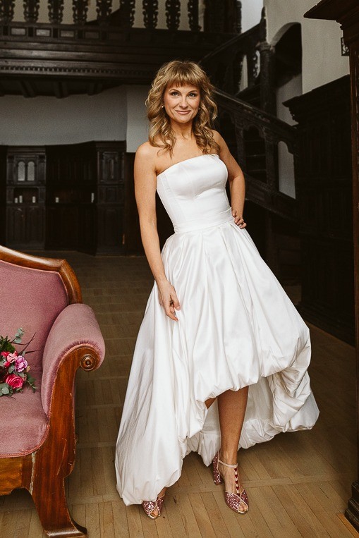 Model doskonale sprawdzi się jako element nowoczesnej stylizacji ślubnej — w połączeniu ze spódnicą lub spodniami pozwala stworzyć spójny, dwuczęściowy zestaw.