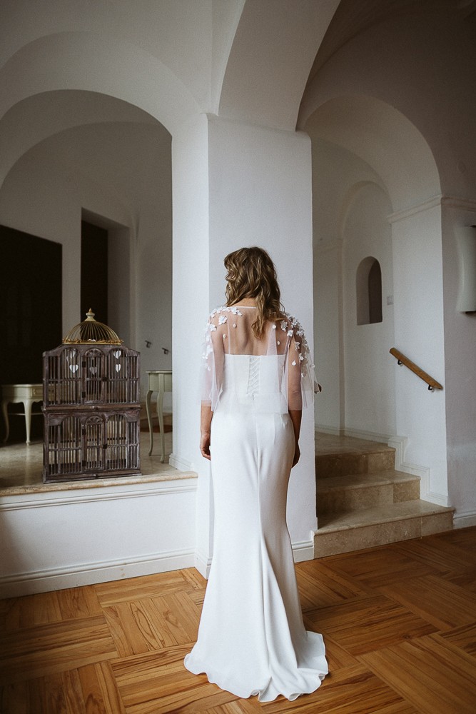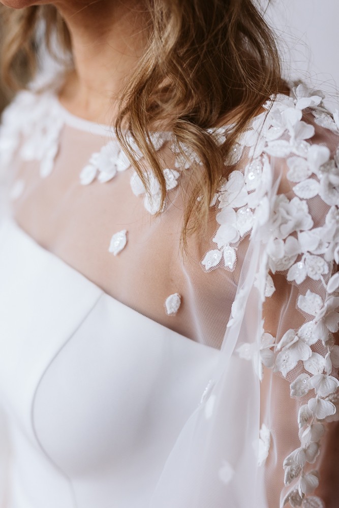 Dekolt typu illusion oraz luźne rękawy nadają całości lekkości i romantycznego wyrazu. Idealna do minimalistycznych sukni jako efektowny, ale subtelny dodatek.
