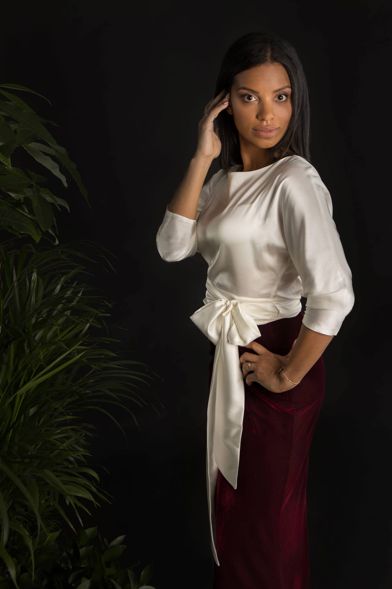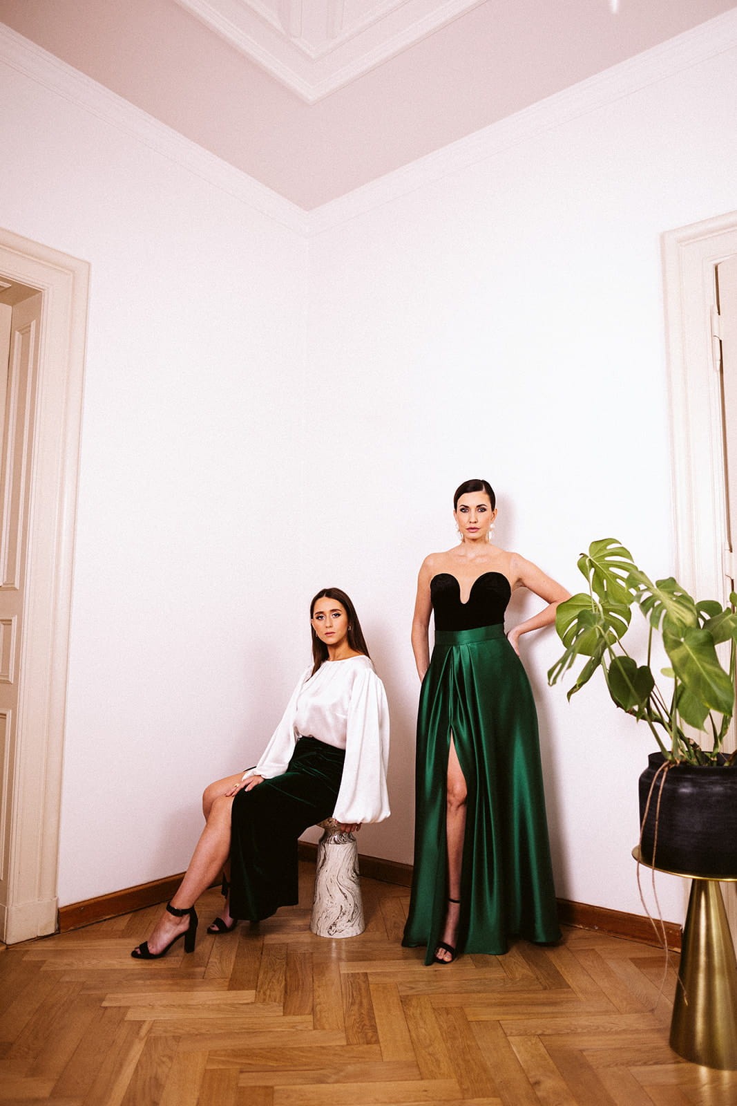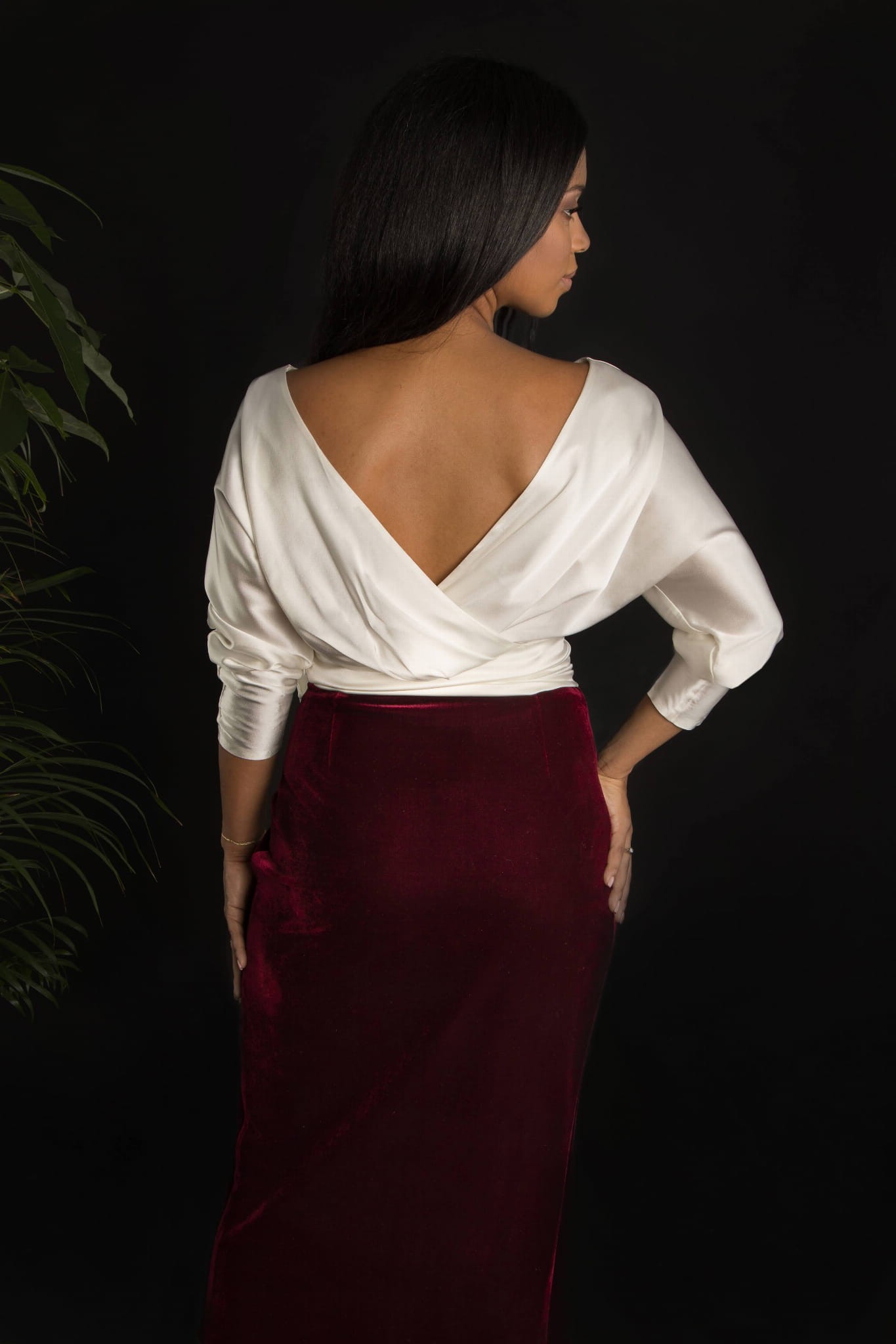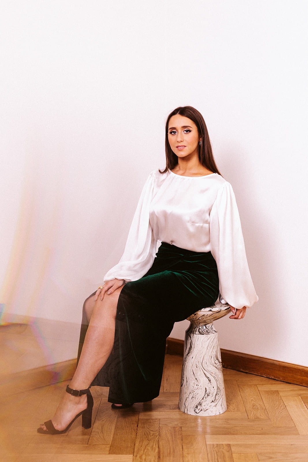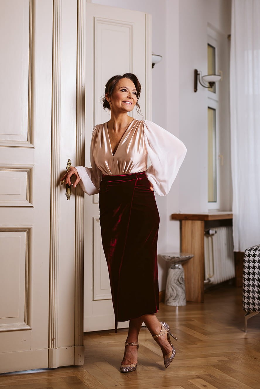Spódnica aksamitna o lekko asymetrycznym, kopertowym kroju i długości 7/8. Prosta i bardzo elegancka forma. Spódnica jest oryginalna i świetnie nada się zarówno na eleganckie wyjścia, jak i na co dzień.