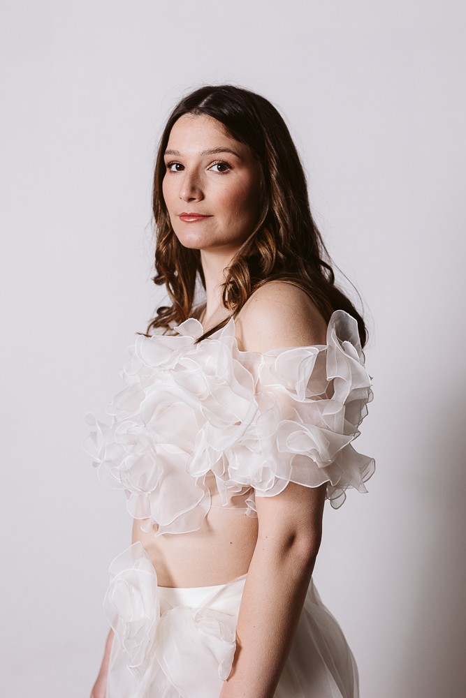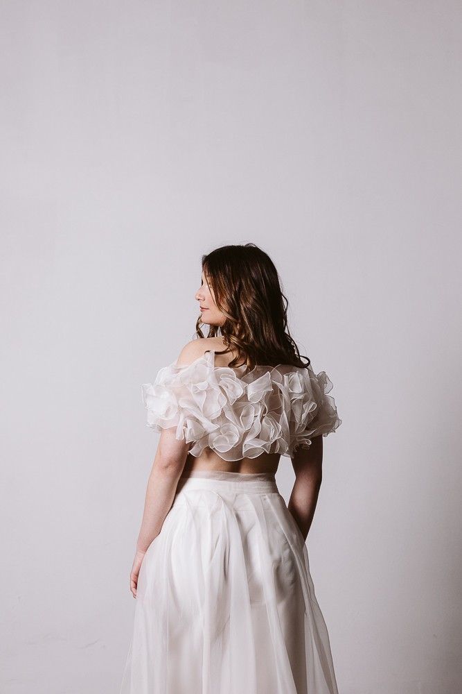 Efektowna, lekka spódnica ślubna wykonana z transparentnej organzy jedwabnej. Model nakładany – zaprojektowany jako warstwa stylizacyjna noszona na spodnie, kombinezon lub inną spódnicę.