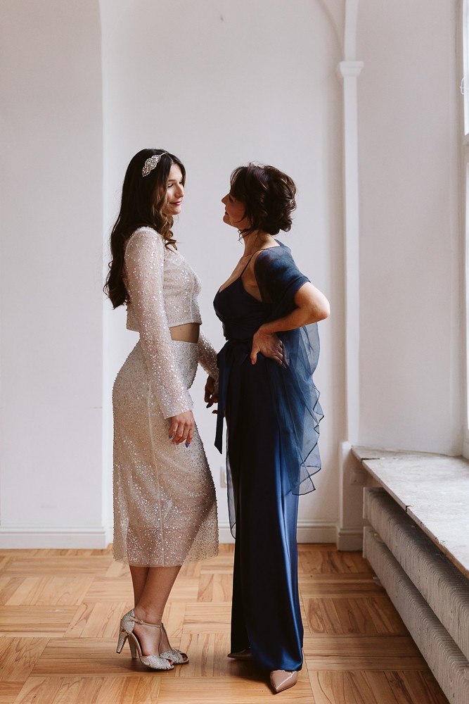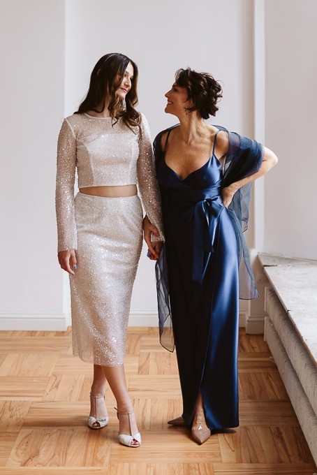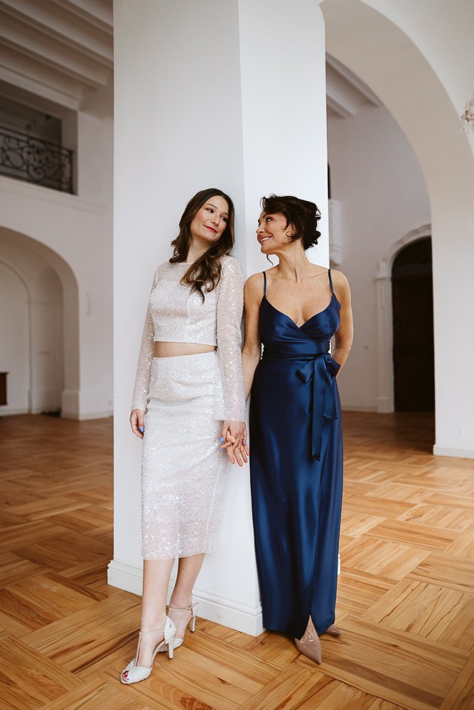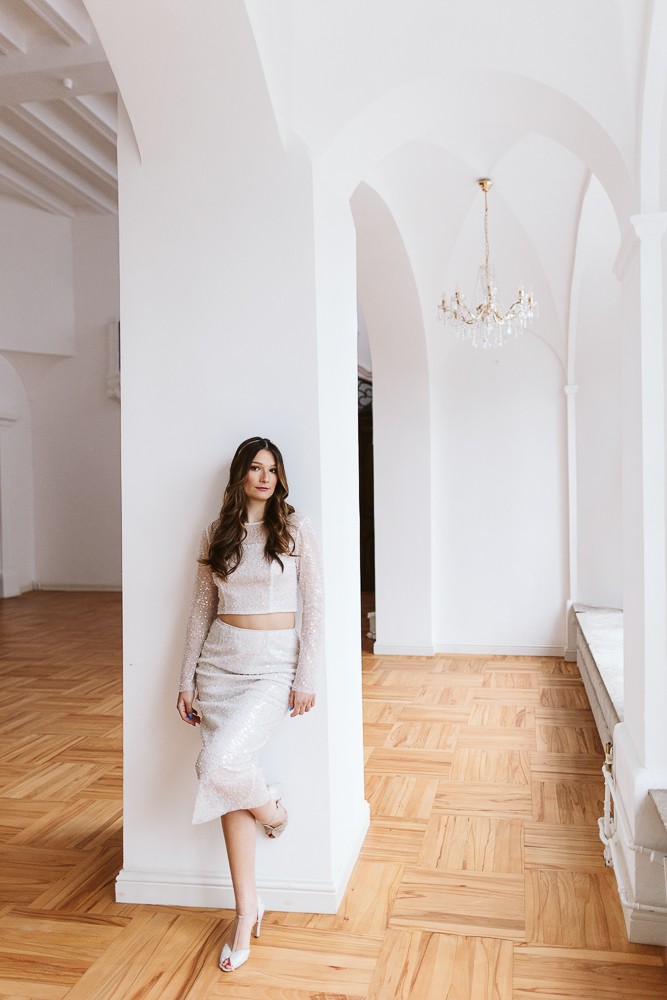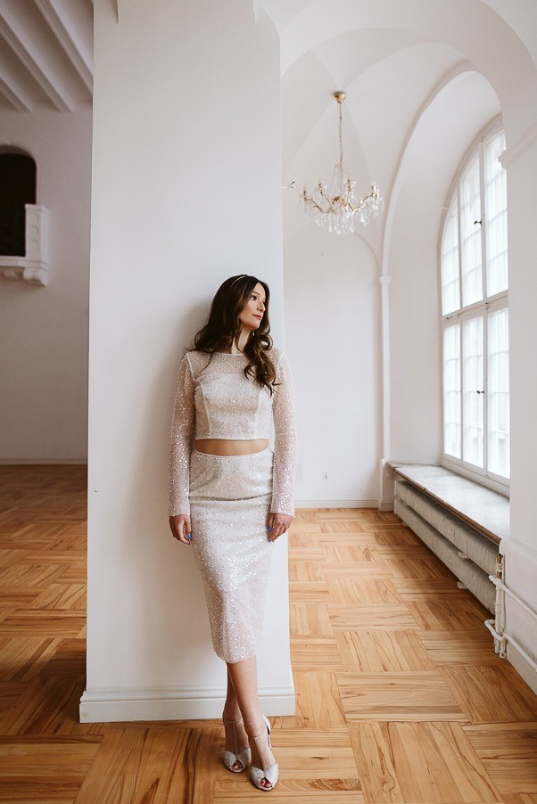 Elegancka spódnica ołówkowa midi to nowoczesna propozycja dla panny młodej, która ceni minimalizm z nutą blasku. Zdobna koronka z perełkami i subtelnie połyskującymi cekinami pięknie odbija światło i przyciąga spojrzenia.