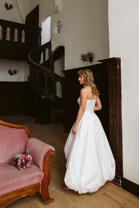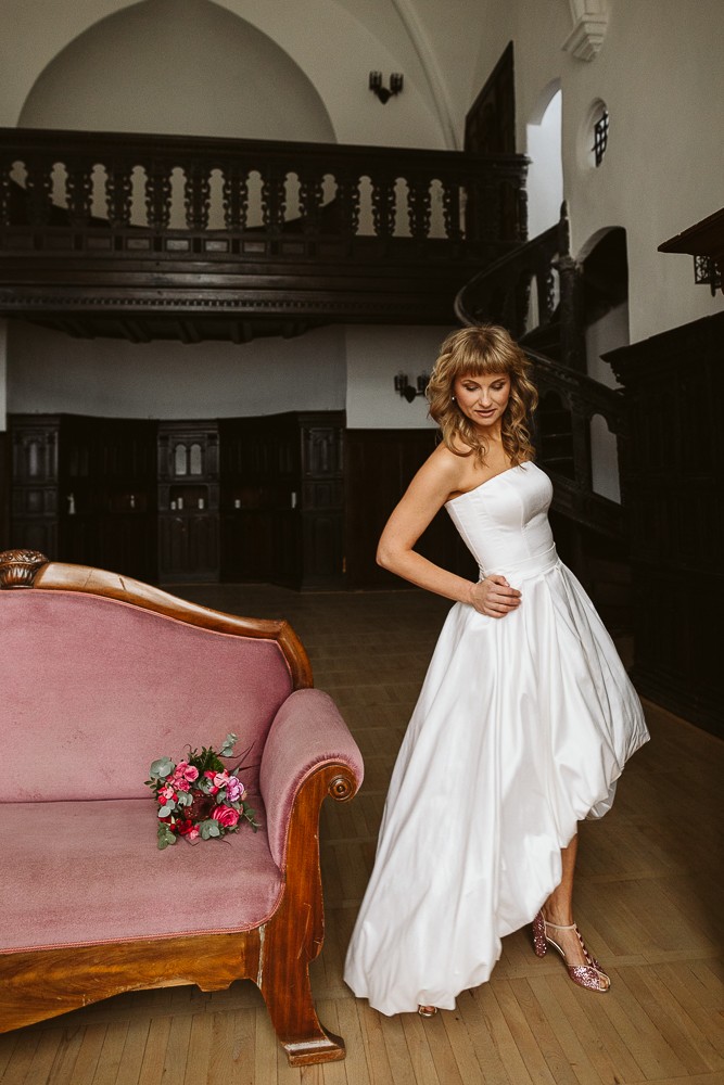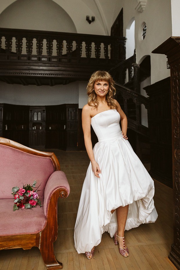 Objętościowy, miękko układający się dół nadaje sylwetce lekkości i wyrazistości, a krótszy przód pięknie eksponuje nogi i buty, jednocześnie wydłużając optycznie sylwetkę. Tył spódnicy delikatnie się wydłuża, tworząc elegancki efekt i dodając całości ślubnego charakteru.