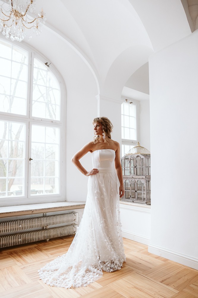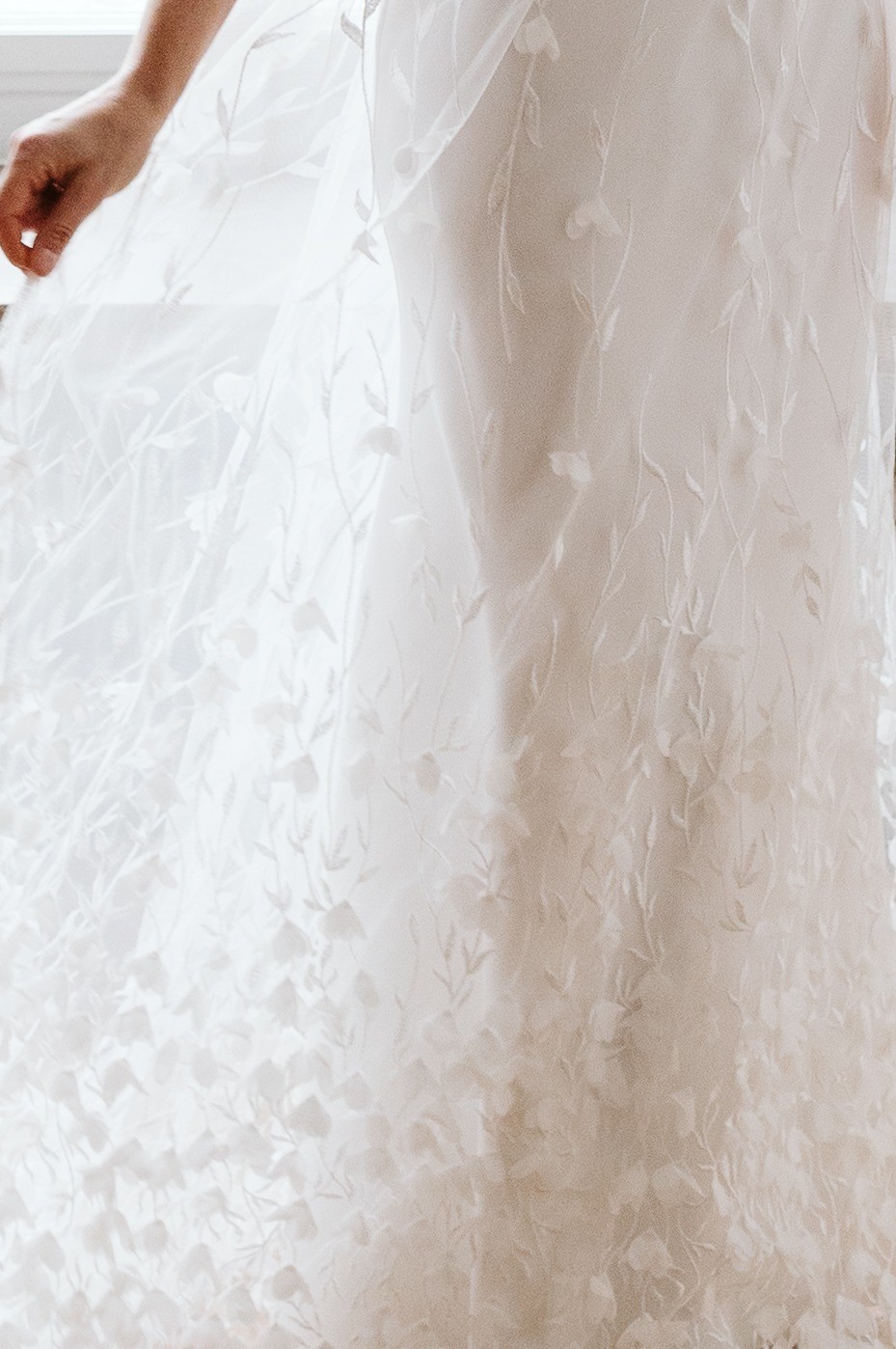 Dzięki swojej formie pozwala na tworzenie nowoczesnych, nieoczywistych zestawień ślubnych. Transparentna struktura materiału subtelnie eksponuje sylwetkę i nadaje stylizacji lekkości.