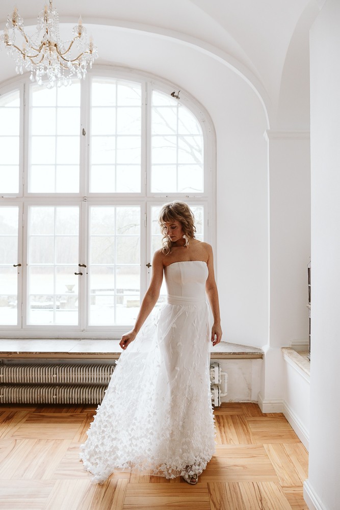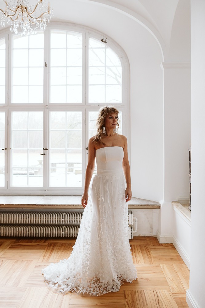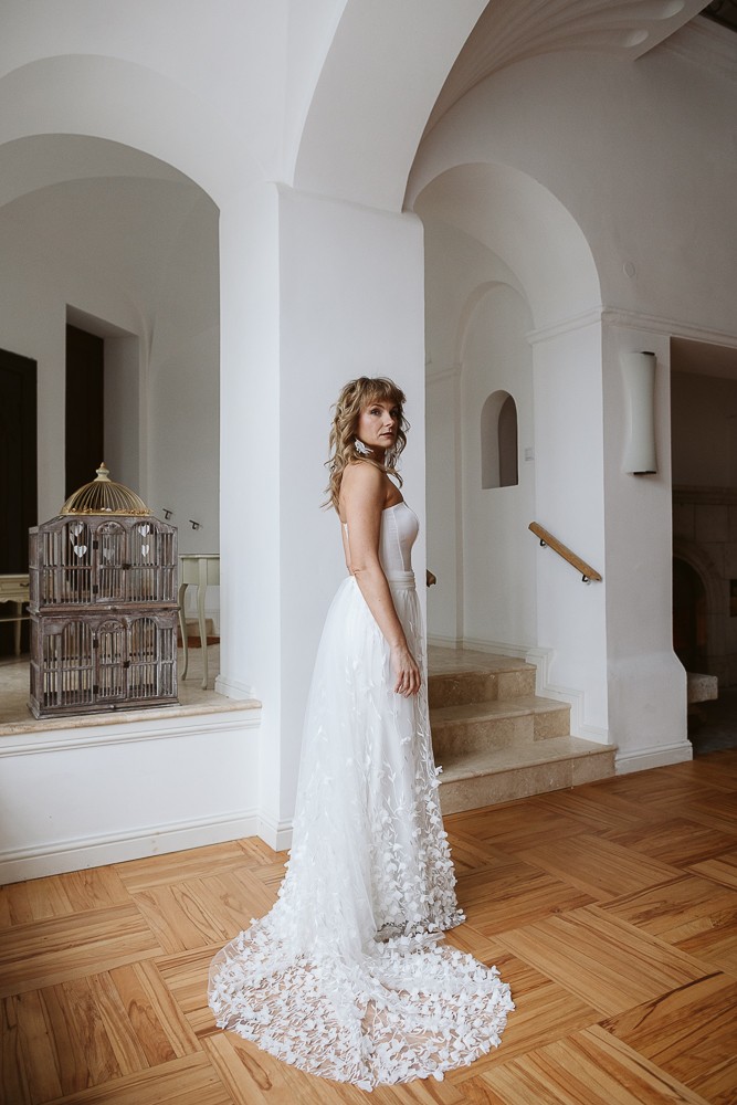 Delikatna, romantyczna spódnica ślubna wykonana z pięknej koronki z kwiatowymi elementami 3D. Spódnica posiada tren i wiązanie w talii umożliwiające regulację w dopasowaniu. Model nakładany – zaprojektowany jako warstwa stylizacyjna noszona na body, spodnie, kombinezon lub inną spódnicę.