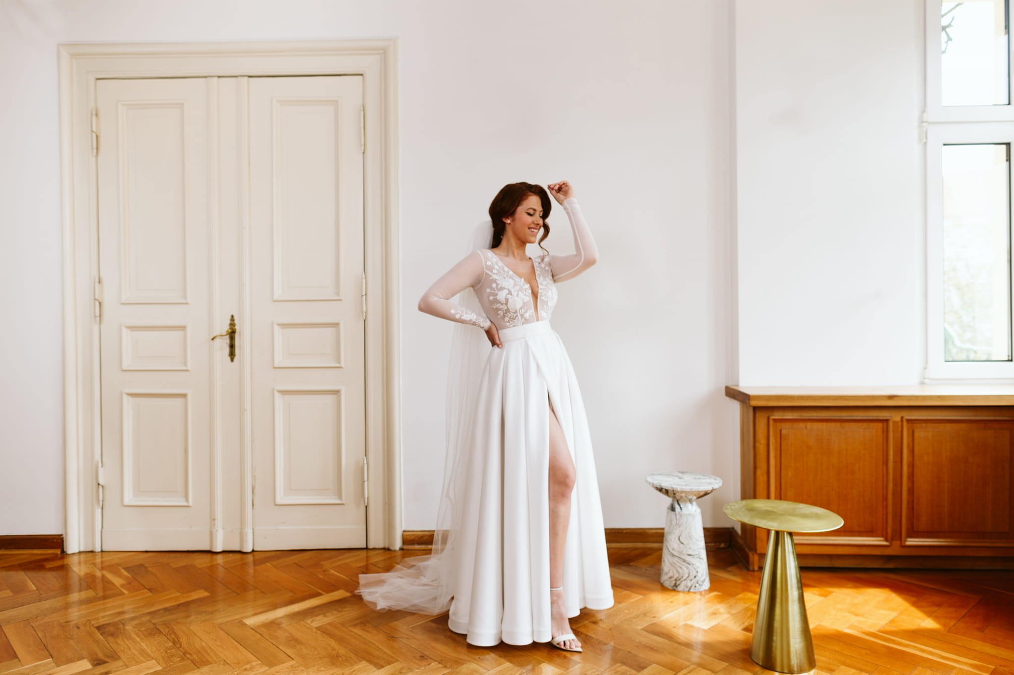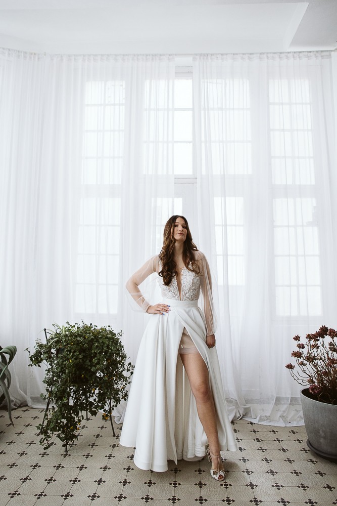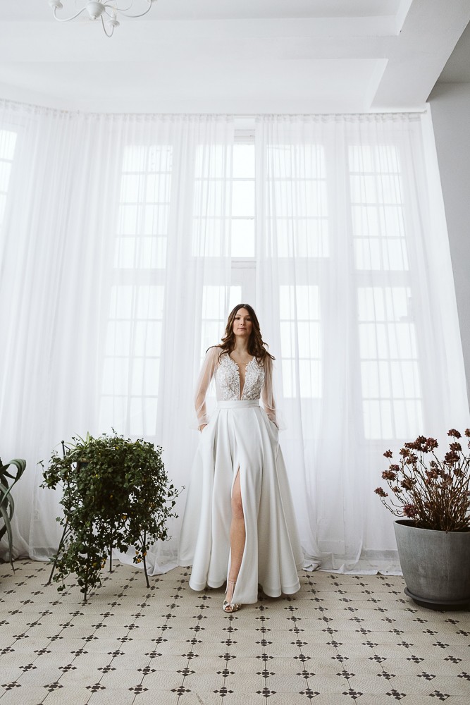 Spódnica doskonale komponuje się z body i bluzkami, ale może pełnić także funkcję efektownej warstwy stylizacyjnej. Założona na krótką sukienkę ślubną pozwala stworzyć spektakularną, długą formę na ceremonię, którą w każdej chwili można zdjąć – odsłaniając lekką, krótszą stylizację na dalszą część uroczystości. To rozwiązanie daje dużą swobodę i pozwala zmienić charakter stylizacji bez konieczności przebierania się.
