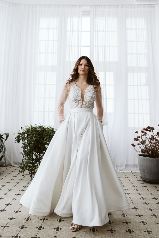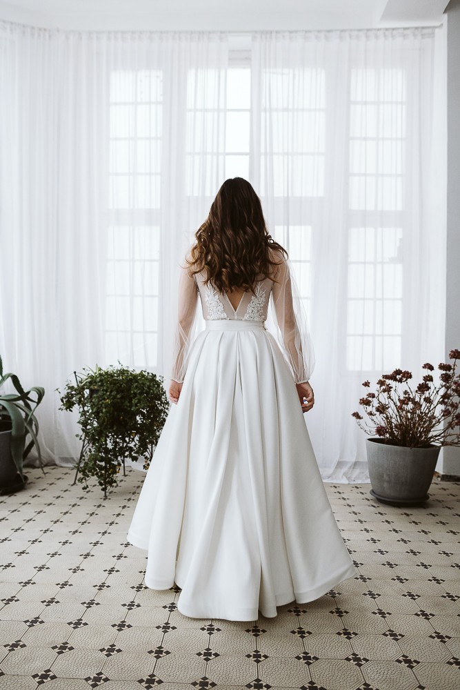 Bardzo efektowna ślubna spódnica maxi wykonana z pięknej, lekko połyskującej tafty Mikado. Kopertowe zapięcie umożliwia regulację w talii oraz subtelne odsłonięcie nogi, nadając sylwetce lekkości i nowoczesnego charakteru. Dół spódnicy został usztywniony krynoliną, co podkreśla jej wyrazistą, rozkloszowaną linię.