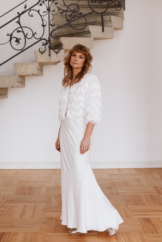 Subtelna i ponadczasowa spódnica ślubna lejąca o kroju lekkiej syrenki to idealna propozycja dla panny młodej ceniącej minimalizm i elegancję. Uszyta z mięsistej, pięknie układającej się tkaniny w kolorze ivory (złamana biel), zachwyca swoją prostotą i szlachetnym wykończeniem.