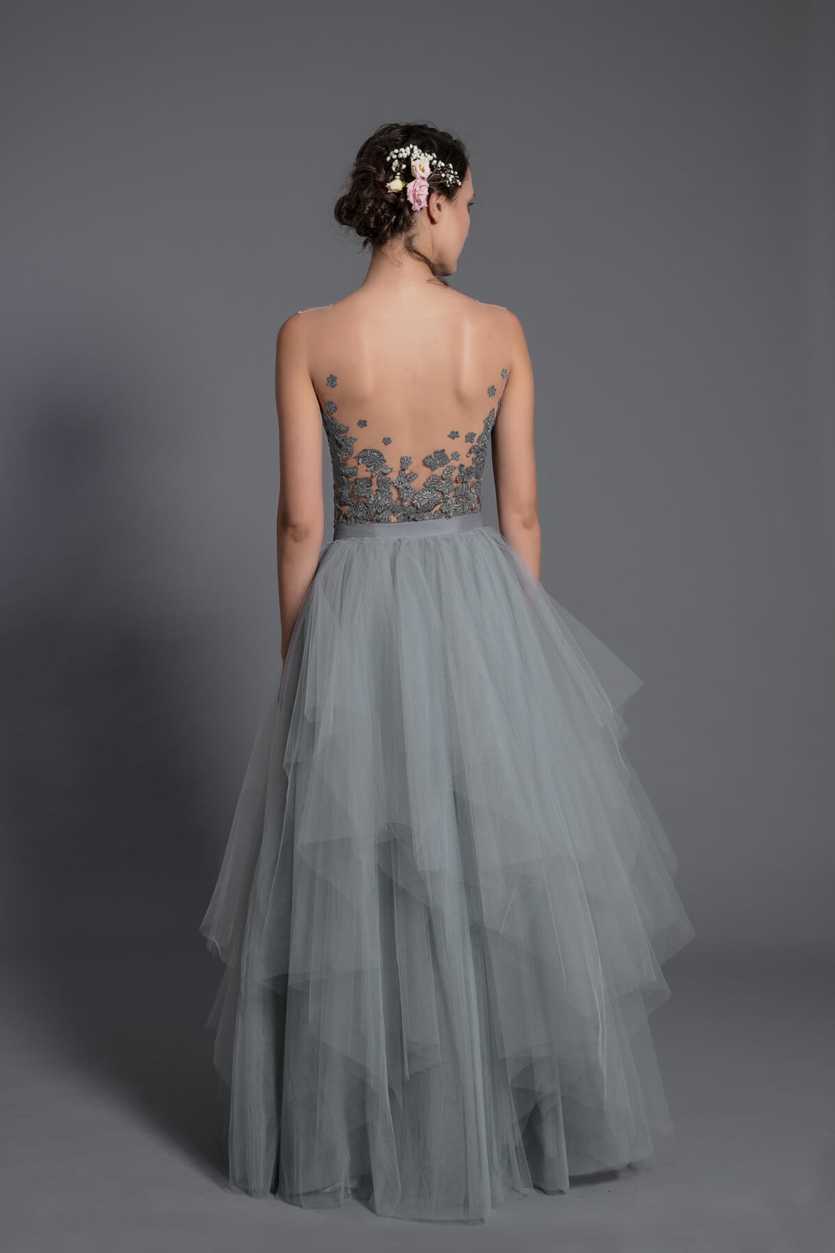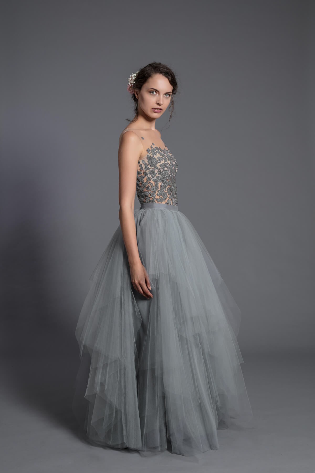 Efektowna, długa, wielowarstwowa spódnica o lekkiej, eterycznej formie. Uszyta z delikatnego tiulu, który miękko układa się na sylwetce, tworząc przestrzenną, nowoczesną linię. Warstwy materiału zostały ułożone w sposób nieregularny, co nadaje całości lekkości i subtelnej dynamiki w ruchu.