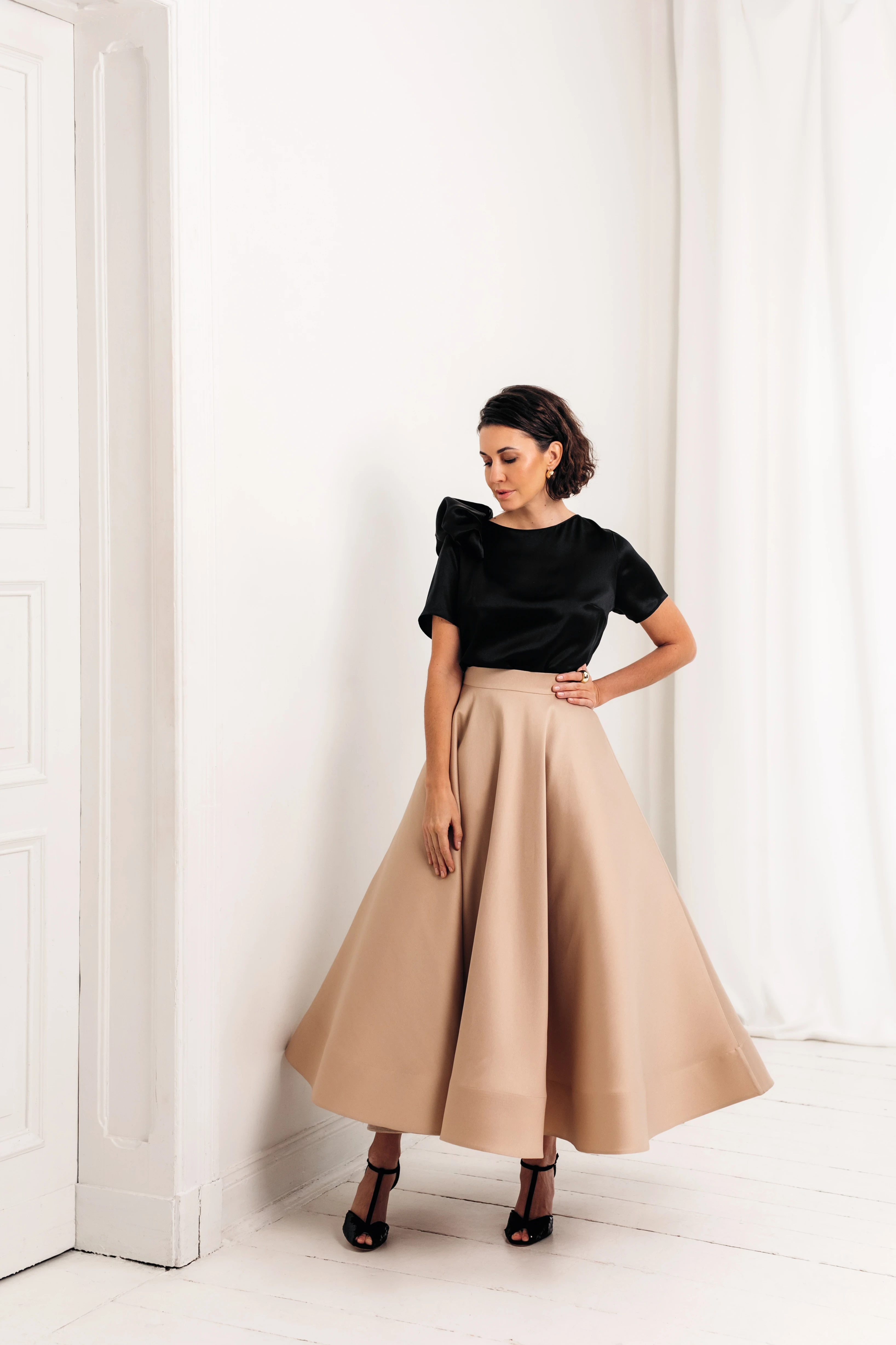 Spektakularna, mocno rozkloszowana spódnica wieczorowa uszyta ze szlachetnego mikado jedwabnego to propozycja dla kobiet, które chcą zachwycić wyjątkową, ponadczasową elegancją. Delikatny połysk materiału w odcieniu subtelnego beżu dodaje stylizacji luksusowego charakteru i sprawia, że całość prezentuje się niezwykle efektownie zarówno w ruchu, jak i podczas spokojnych chwil.