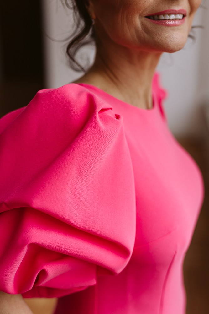 Efektowne bufiaste rękawy nadają stylizacji charakteru, a dekolt łódka z przodu subtelnie podkreśla ramiona. Tył zdobi dekolt w szpic, który dodaje lekkości i kobiecego uroku.