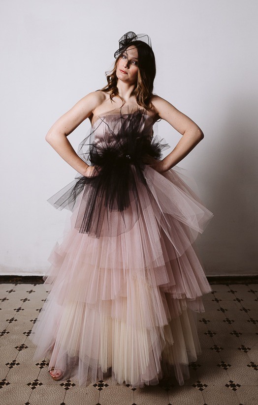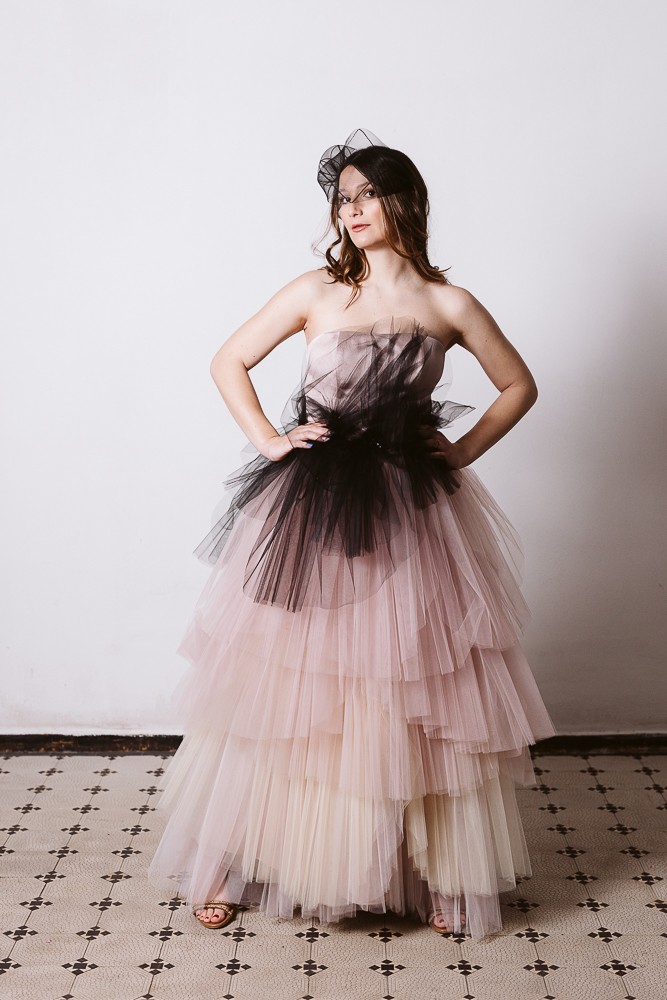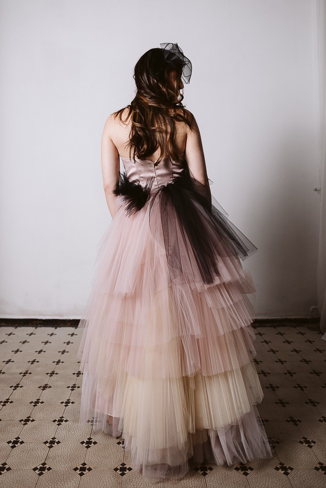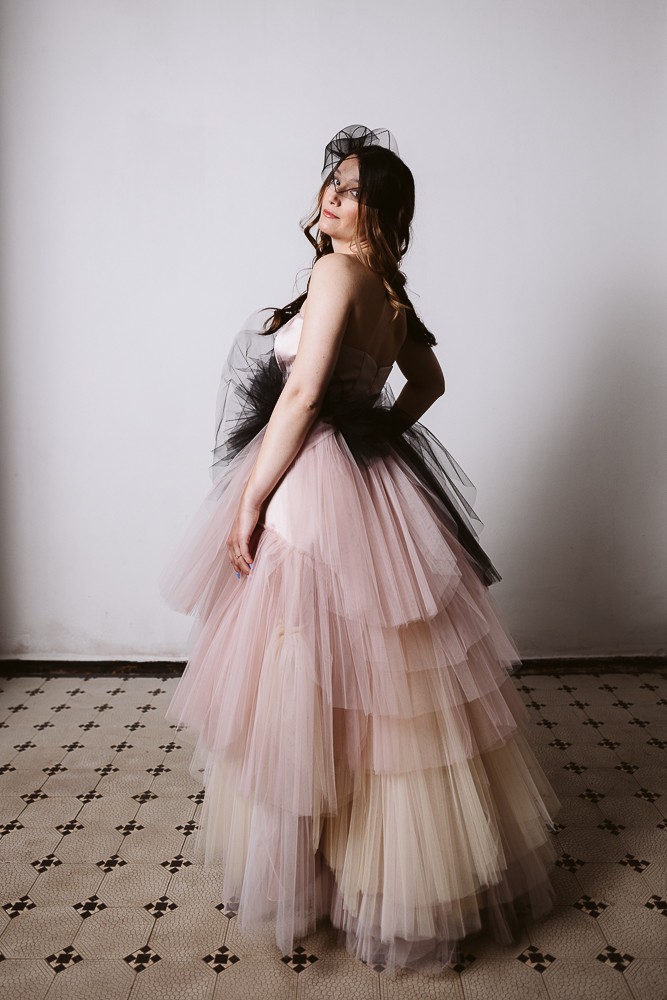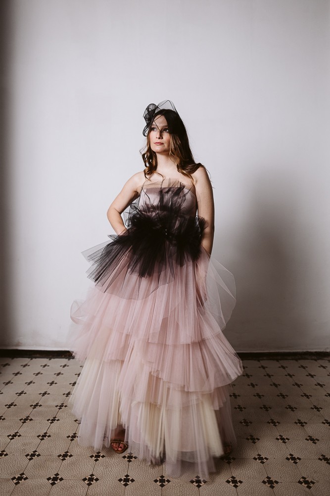 Dół sukni zbudowany jest z wielu warstw fantazyjnie ułożonego tiulu w przenikających się odcieniach — od waniliowego, przez szampański, aż po głęboką czerń. Tkanina tworzy przestrzenną, wielowymiarową formę, która pięknie pracuje w ruchu i nadaje całości wyjątkowej lekkości. Subtelny tren dopełnia sylwetkę i podkreśla jej balowy charakter.