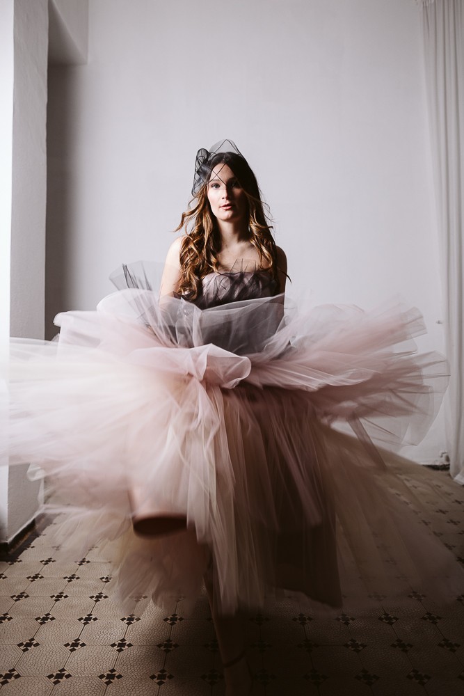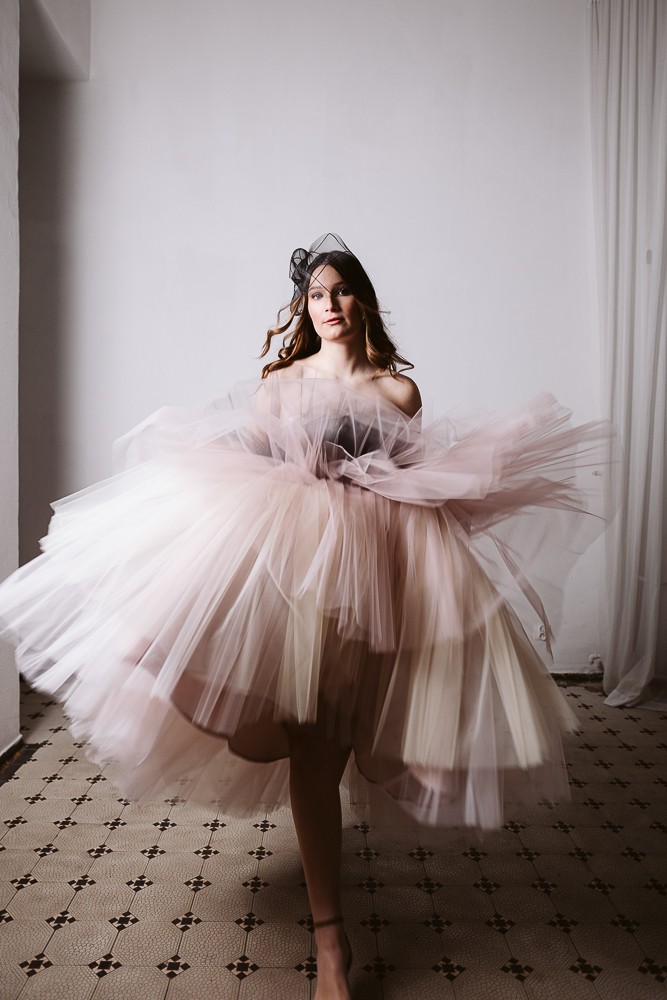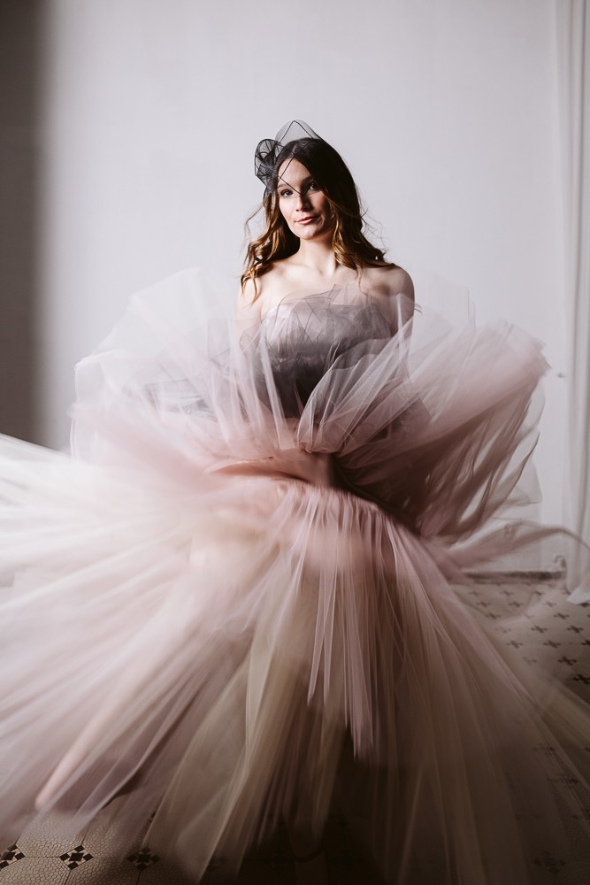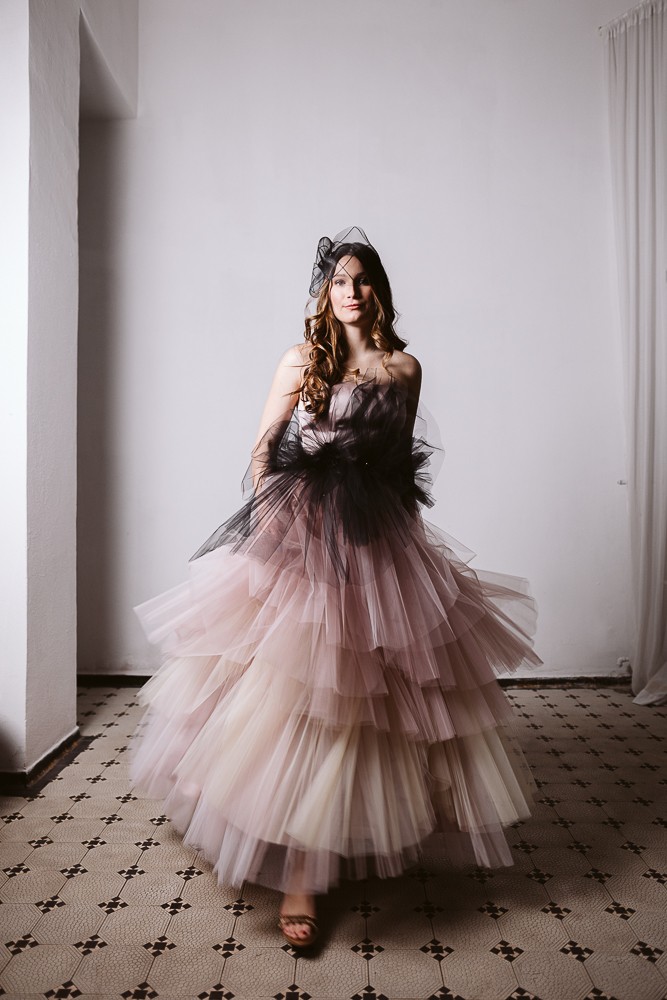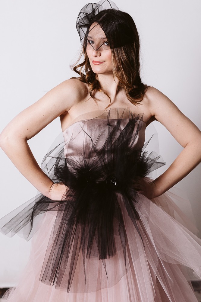 Dół sukni zbudowany jest z wielu warstw fantazyjnie ułożonego tiulu w przenikających się odcieniach — od waniliowego, przez szampański, aż po głęboką czerń. Tkanina tworzy przestrzenną, wielowymiarową formę, która pięknie pracuje w ruchu i nadaje całości wyjątkowej lekkości. Subtelny tren dopełnia sylwetkę i podkreśla jej balowy charakter.