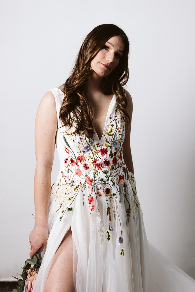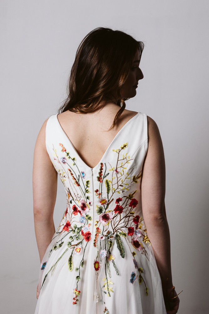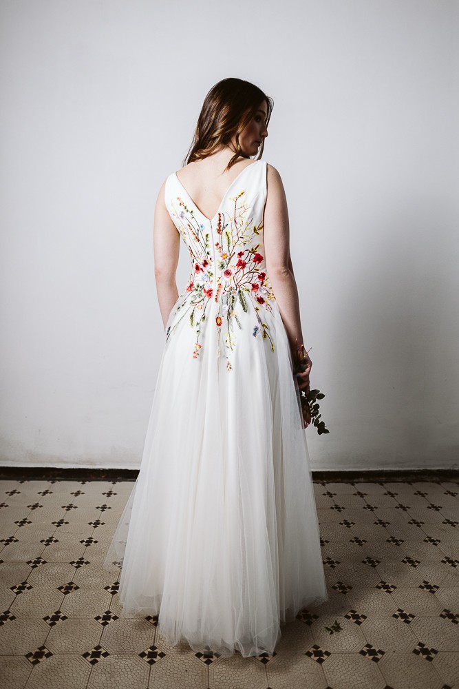 Romantyczna i niezwykle kobieca suknia ślubna z kolorowym haftem kwiatowym to propozycja dla panny młodej, która marzy o lekkiej, artystycznej stylizacji. Dopasowana góra zdobiona misternym, kolorowym haftem inspirowanym naturą przyciąga uwagę i nadaje całości wyjątkowego charakteru.