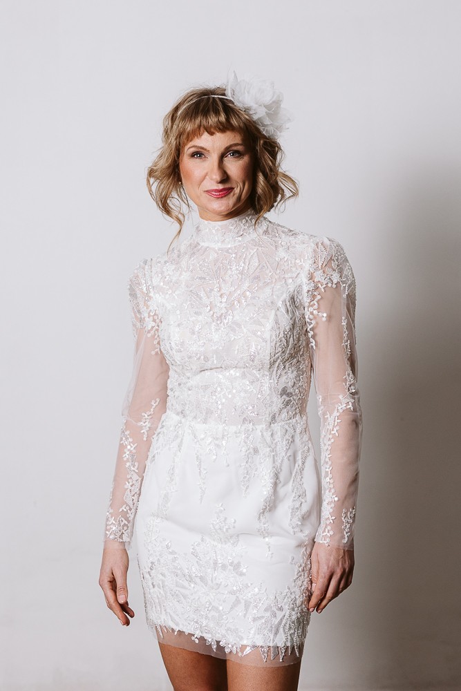 Wyjątkowa sukienka nie tylko ślubna mini stworzona dla kobiet, które cenią elegancję w nowoczesnym wydaniu. Model dopasowany do sylwetki, uszyty z niezwykle zdobnej koronki subtelnie połyskującej cekinami, które pięknie odbijają światło.