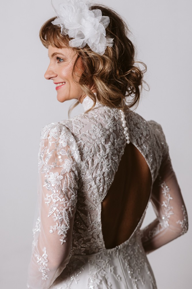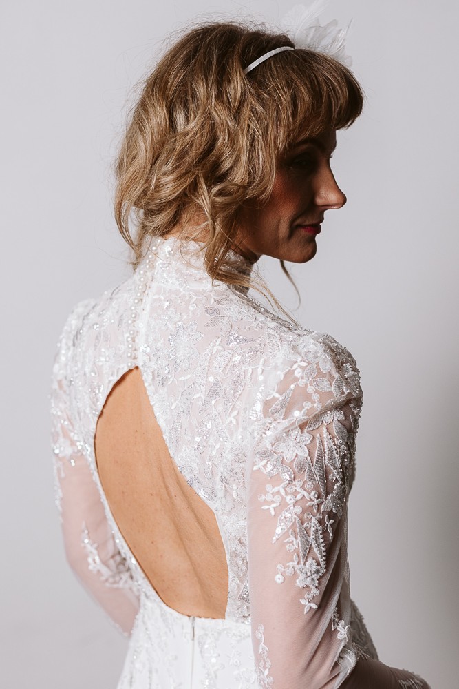 Góra sukienki jest zabudowana, wykończona elegancką stójką, co nadaje całości szyku i klasy. Długie, transparentne rękawy dodają lekkości i podkreślają delikatny charakter projektu dodając elegancji lekkimi bufkami w ramionach. Tył sukienki zapinany jest na ozdobne guziczki w formie perełek, a obłędny dekolt subtelnie eksponuje plecy.