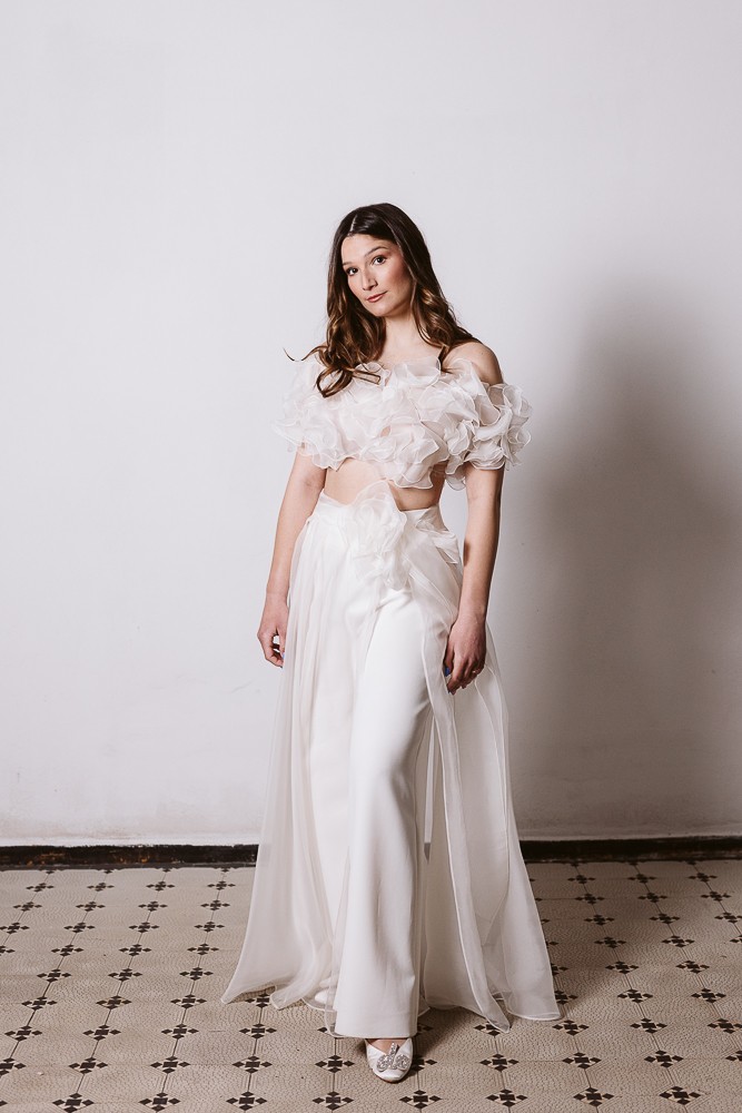 To model niezwykle pracochłonny i ekskluzywny, dopracowany w każdym detalu. Może być noszony bezpośrednio na ciało – do spódnicy lub spodni – albo jako spektakularne wykończenie sukni ślubnej.