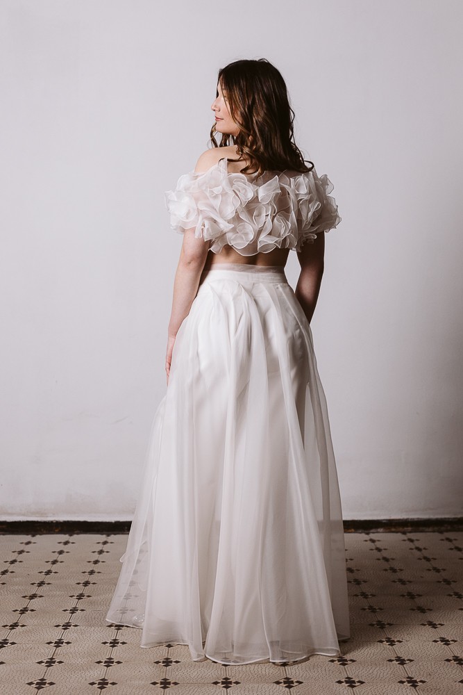 Płatki układają się miękko wokół sylwetki, tworząc formę przypominającą lekką jak piórko chmurkę. Transparentna baza sprawia, że top subtelnie odsłania ciało, nadając stylizacji zmysłowego, ale wciąż bardzo eleganckiego charakteru.