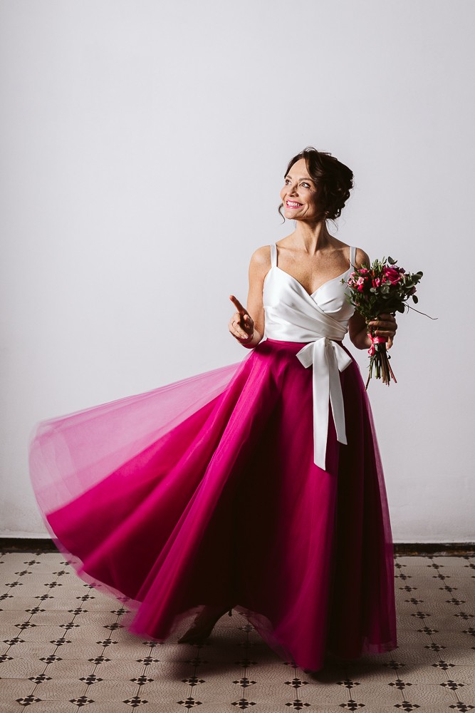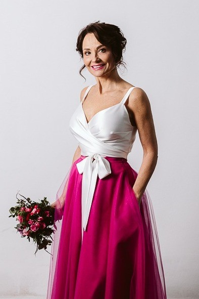 Doskonale sprawdzi się jako element nowoczesnej, dwuczęściowej stylizacji ślubnej — w połączeniu ze spódnicą, spodniami lub pod marynarką.
