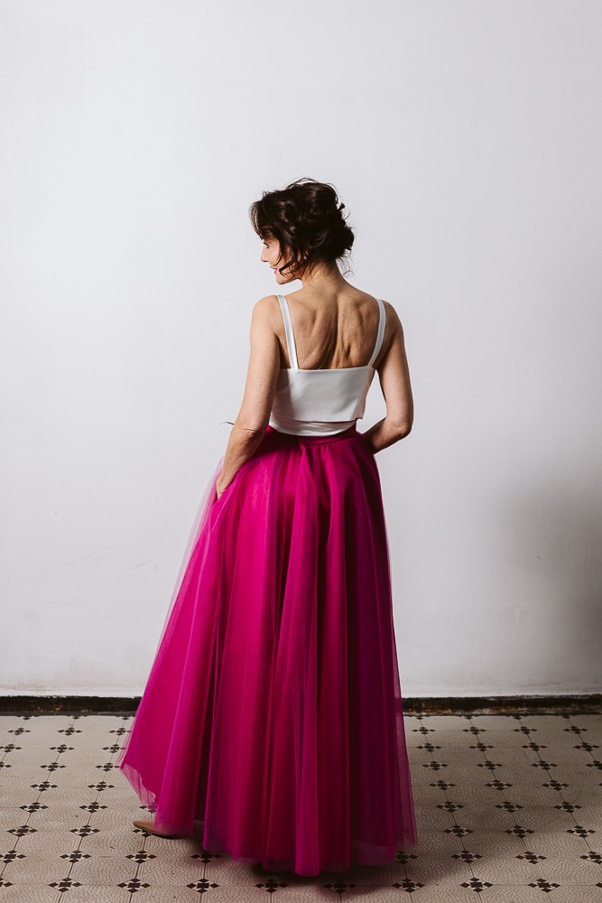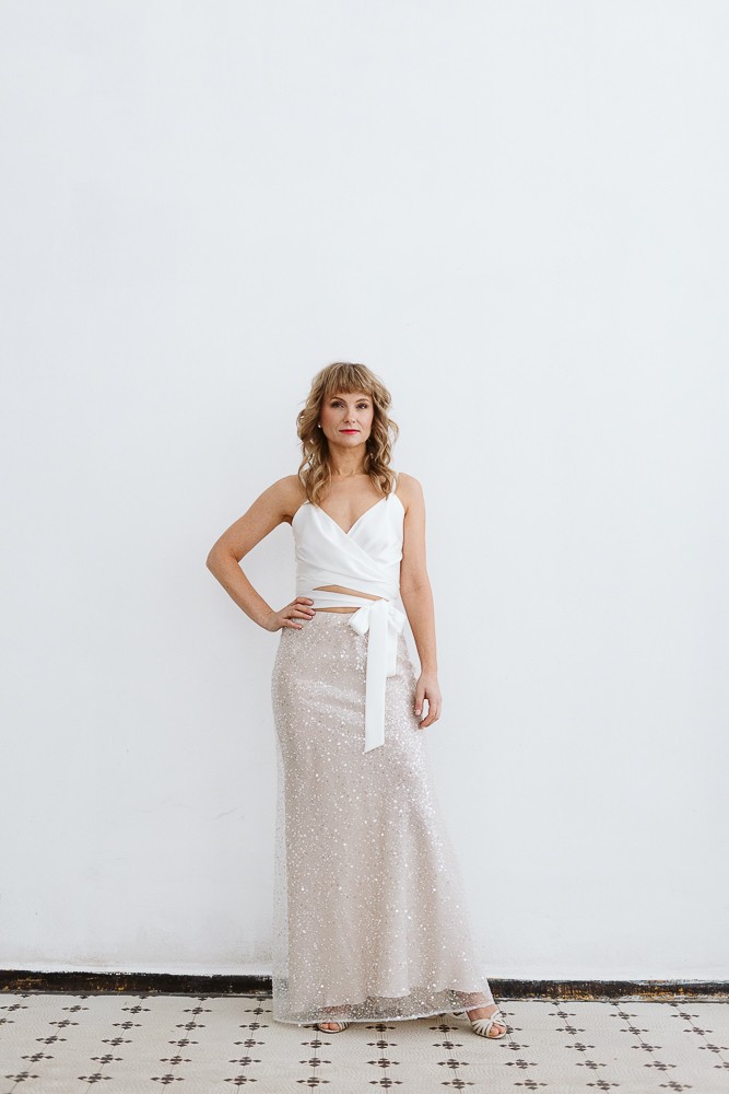 Elegancki, lekki top ślubny w kolorze złamanej bieli (ecru), o nowoczesnej i subtelnej formie. Uszyty z lejącej satyny triacetatowej, delikatnie połyskuje i miękko układa się na sylwetce, nadając stylizacji lekkości.