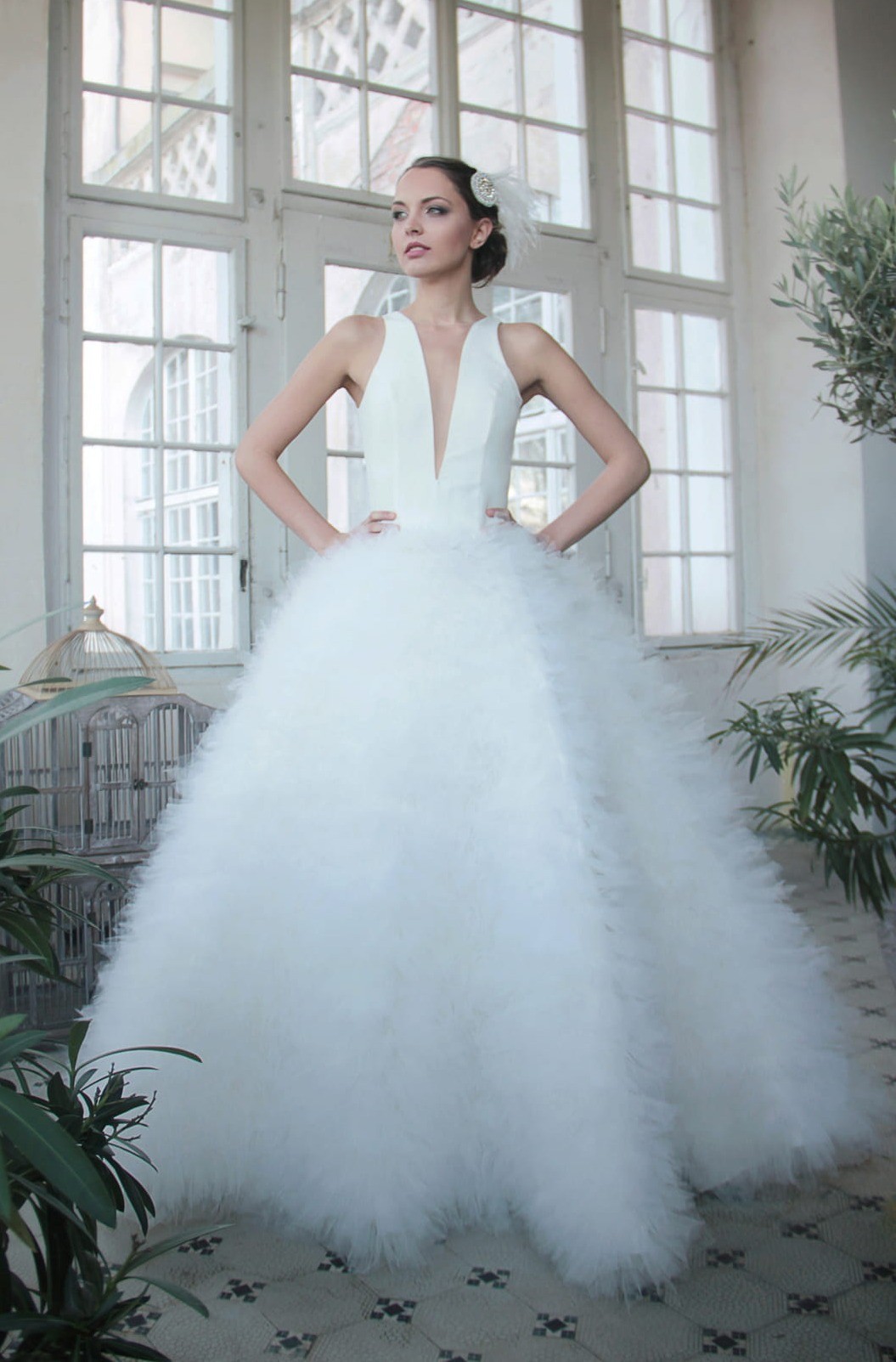 Dół to prawdziwe dzieło sztuki – powstał z około 40 metrów tiulu, który naszywany jest specjalną metodą, nadającą iluzję delikatnych piór. Dzięki temu suknia zyskuje niesamowitą objętość i spektakularny, lekko unoszący się efekt przy każdym ruchu. Mocno rozkloszowany fason oraz długi tren sprawiają, że kreacja prezentuje się zjawiskowo zarówno podczas ceremonii, jak i na sesji zdjęciowej.